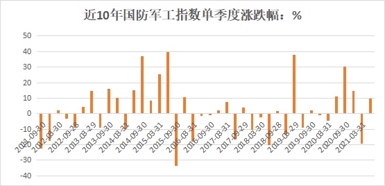 我们看近10年国防军工板块各季度的涨跌幅表现,发现基本都是大起大落,除了2014-2015、2020年大牛市期间,很少能持续上涨3个季度。在最近的40个完整季度里,军工上涨、下跌的季度分别为21、19,几乎是五五开。涨幅超过10%的季度有12个,跌幅超过10%的季度有9个,涨跌幅度超过10%的季度合计有21个,超过一半,大涨大跌特性显著。