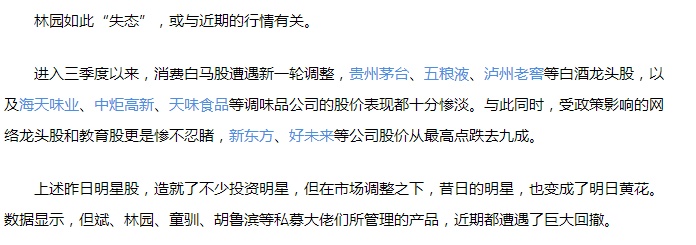 林园,但斌之流,他们选择的是这些板块类个股,恰好是处于熊市之中,投资者一方面看到一些板块夜夜笙歌,另一方面,看到自己的基金产品净值不断的下滑,也是非常着急的。