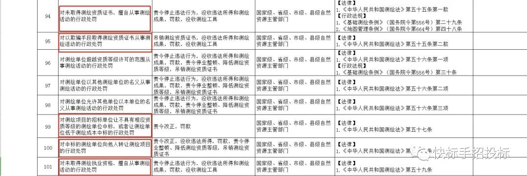 对测绘项目的招标单位让不具有相应资质等级的测绘单位中标,或者让测绘单位低于测绘成本中标的行政处罚,将责令改正,罚款。