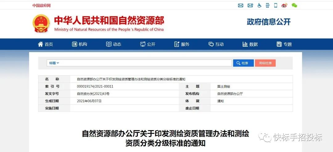 2021年6月7日,自然资源部办公厅发布关于印发测绘资质管理办法和测绘资质分类分级标准的通知,将印发修订后的《测绘资质管理办法》和《测绘资质分类分级标准》,并自2021年7月1日起施行,原国家测绘地理信息局2014年7月1日发布的《关于印发测绘资质管理规定和测绘资质分级标准的通知》(国测管发〔2014〕31号)同时废止。
