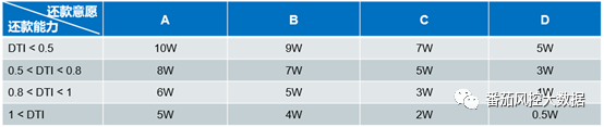 以上关于DTI的授信矩阵,相关的额度矩阵数据,简单如下: