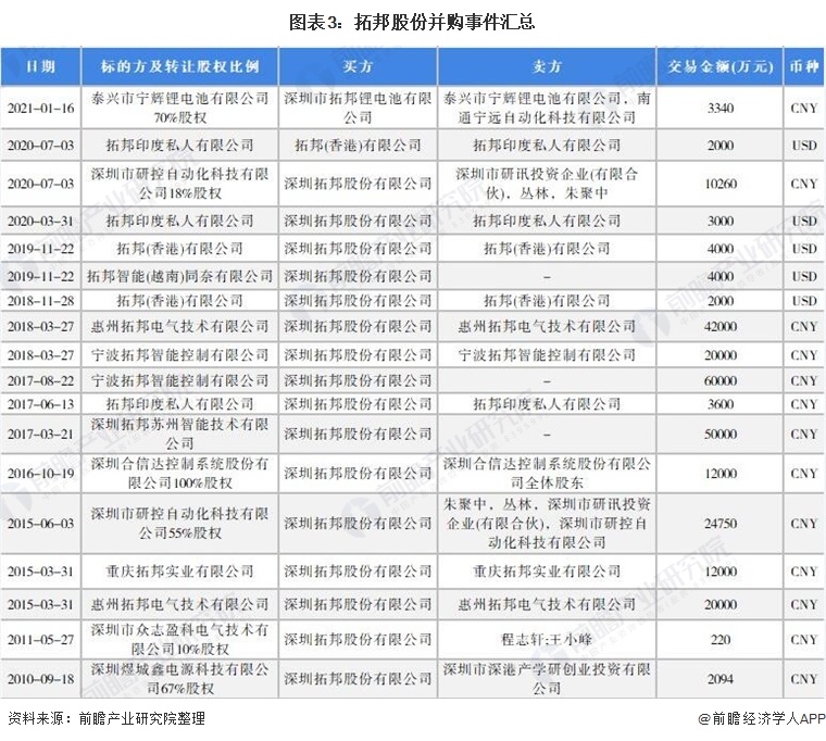 公司自上市以来,持续快速发展,借助资本市场带来的良好效应,公司资产、业务、机构和人员都得到进一步扩张,并购脚步也不断加快。2010年,拓邦股份通过并购深圳煜城鑫电源科技有限公司进军锂电池市场;2011年,并购深圳市众志盈科电气技术有限公司快速健全产品链、提升智能控制产品在更高端领域的应用;2015年,并购深圳市研控自动化科技有限公司,加速了公司向工业控制领域发展的步伐;2016年,并购深圳合信达控制系统股份有限公司,公司进入燃气控制领域,与原有业务形成协同效应。在外延式发展和内生式发展相结合的方式下,公司规模持续扩张,推动智能控制器业务的发展。