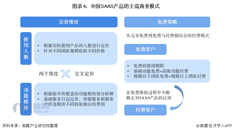 然而,迫于现金流压力和资本市场压力,过去很多宣称完全免费的SaaS产品纷纷开始转向收费。目前SaaS厂商主要是基于客户所使用的功能模块和使用产品的人数两个维度进行差异化定价。虽然告别了产品完全免费的商业模式,但免费依然在SaaS厂商的定价策略中占有一席之地,如免费的试用期限、基础功能免费+高级功能付费、规模以下团队免费+规模以上团队付费等。部分免费能够让客户以零成本率先体验SaaS产品,并在体验过程中不断修正对服务质量的感知,通过切入客户生产经营的核心痛点,培养客户对此进行持续付费的意愿,才是SaaS商业模式的基础。