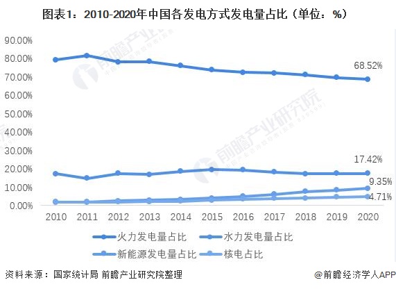 2010年以来,我国火力发电量占比一直呈现下降趋势,2020年,火力发电量同比上升2.11%,而占比依旧下滑1.05个百分点;与此相对的是逐年增长的新能源发电量,2020年我国新能源发电量7273.53亿千瓦时,同比增长15.36%,占总发电量的9.35%,创历史新高。