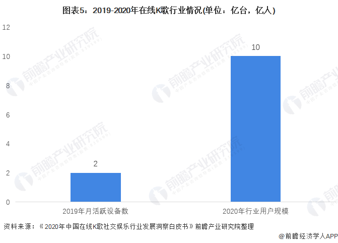 《2020年中国在线K歌社交娱乐行业发展洞察白皮书》显示,至2019年,在线K歌行业月活跃设备数已达2亿。企查猫数据显示,截至2020年,行业用户规模已突破10亿人。
