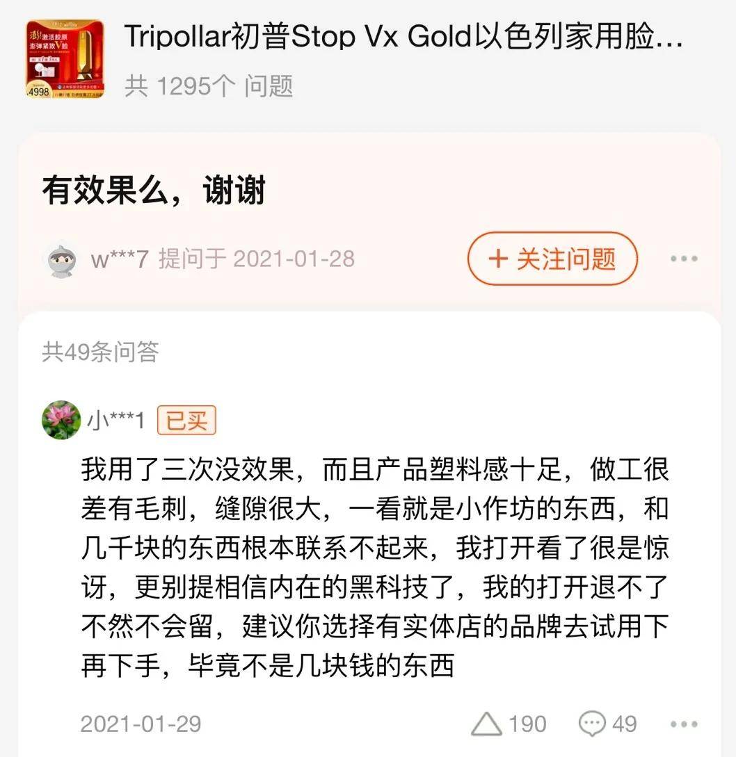 镭射财经在Tripollar初普淘宝旗舰店内发现,不少用户对其质量问题颇有微词,认为自己交了“智商税”。在销量最高的一款产品中,有用户表示,“用了三次没效果,而且产品塑料感十足,做工很差有毛刺,缝隙很大,一看就是小作坊的东西。”。
