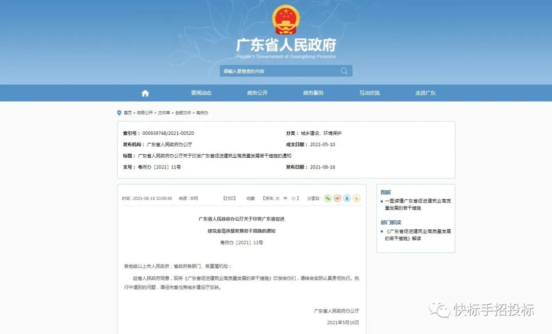 加快建设建筑强省,全面提升工程品质和产业现代化水平,8月16日,广东省人民政府办公厅发布《广东省人民政府办公厅关于印发广东省促进建筑业高质量发展若干措施的通知》。