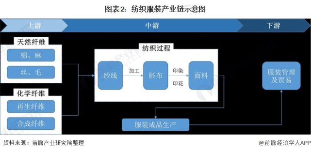 纺织服装产业链包括上游原材料供应和制造业,中游服装制造业和下游服装管理业及贸易业。下游品牌零售部分:以国内内销市场为主,其核心的关键点在于:品牌、产品设计、渠道、供应链等。由于纺织服装的制造环节众多,因此所关联的纺织服装产业链相关企业的数量和类型业较多