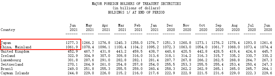 ATFX观察:根据美国财政部的最新数据,截止2021年6月,日本持有美债总额1.2773万亿美元,位居世界第一(除美国自身外);中国持有美债总额1.0619万亿美元,处在第二的位置。第三名为英国,不过其持有美债总额只有4529亿美元,与第二名差距较大,不作为重点关注对象。