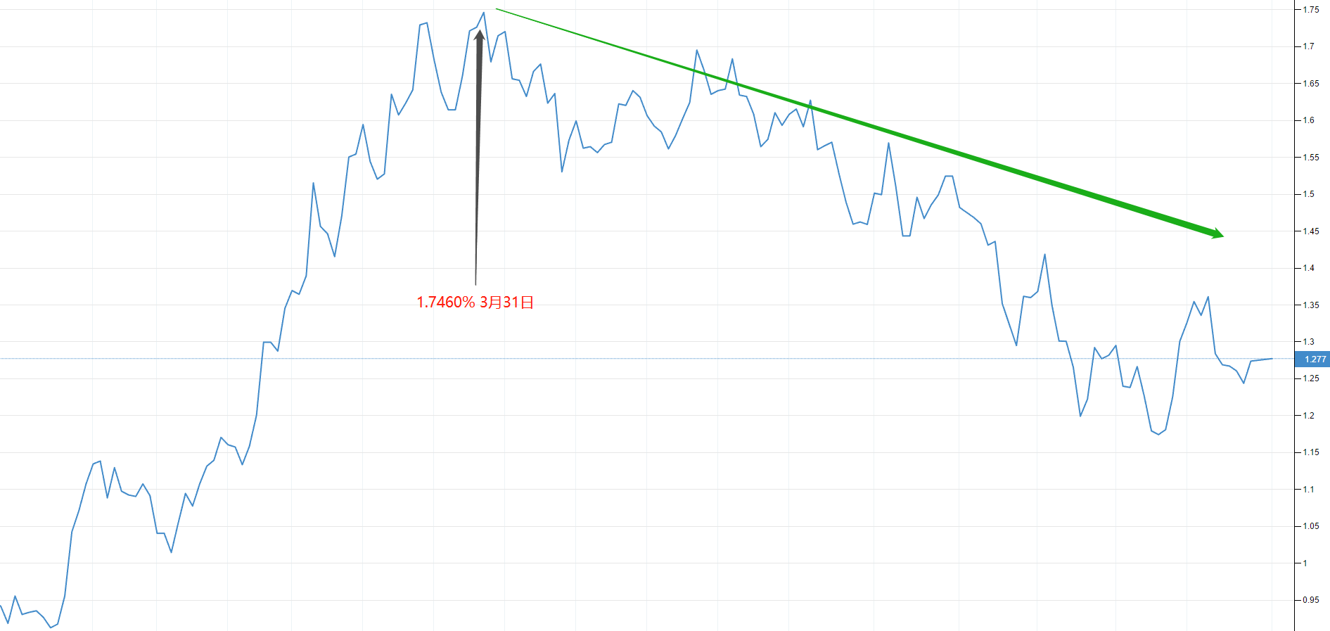 上图是十年期美债收益率曲线走势图。显然,在3月份之前,债券收益率持续大幅上涨,最高触及1.7460% 。上涨的原因,是因为日本正在这段时间大举抛售美债。3月份之后,美债收益率持续下行,最低触及1.1738% 。这一轮下跌,是因为日本转而大举买入美债。但由于中国同期的抛售,所以3月份之后的债券收益率曲线下跌的非常曲折缓慢。