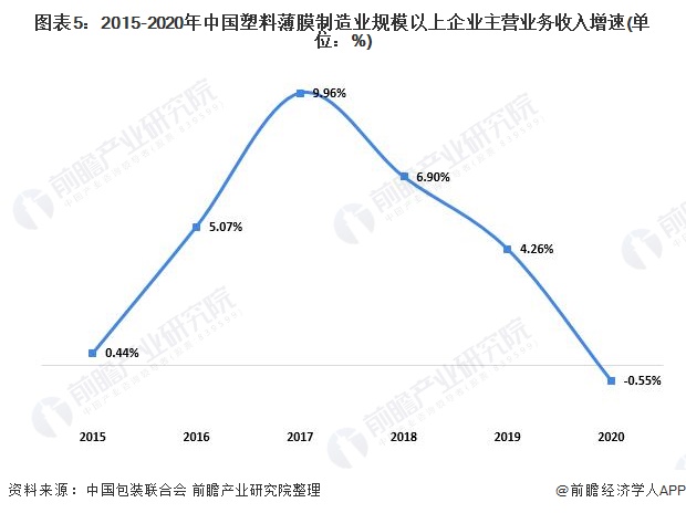2015-2019年,我国塑料薄膜制造业规模以上企业(年营业收入2000万元及以上全部工业法人企业)主营业务收入不断增加,近年来增速有所放缓。但2020年规模以上企业收入有所下降。根据中国包装联合会数据显示,2020年我国塑料薄膜制造业规模以上企业完成累计营业收入2754.35亿元,同比下降0.55%。
