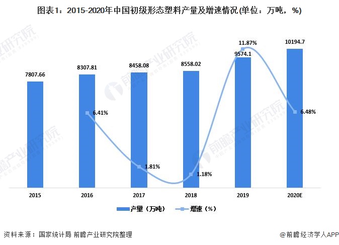 2015-2019年,我国初级形态塑料产量逐渐增加。2019年全国初级形态塑料产量为9574.1万吨,同比增长11.87%。2020年我国初级形态塑料产量约为10194.7万吨。