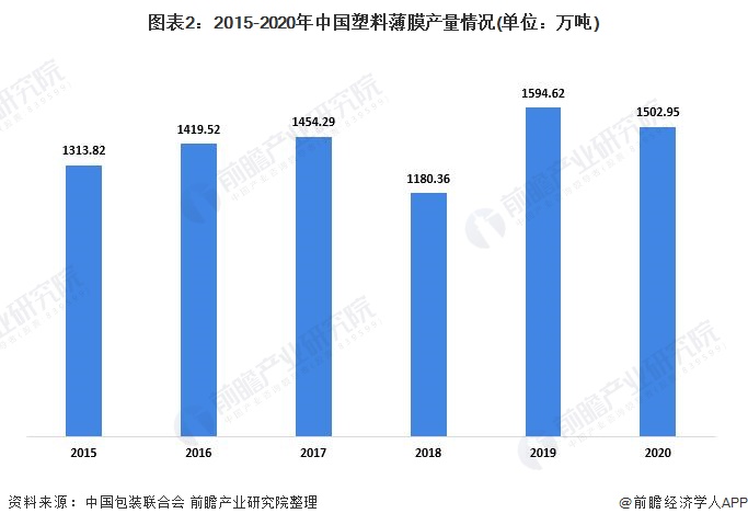 2015-2019年,我国塑料薄膜产量整体呈波动趋势。2020年,我国塑料薄膜行业累计完成产量1502.95万吨,同比下降6.37%。