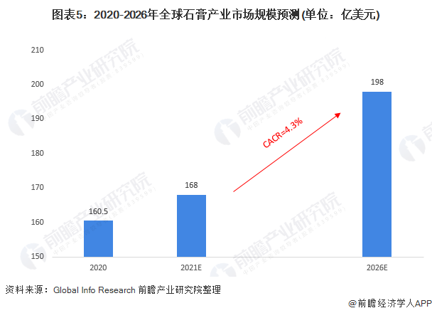 石膏的需求,与建设部门,尤其是商业部门和住宅部门的成长有直接关系。先进国家市场与新兴国家市场双方预计建设支出大幅度复苏,对高品质住宅与更佳生活条件的需求高涨,大规模的工业化,主要市场上的政府的政策支援等要素,短中期性带动这个石膏市场。Global Info Research数据显示,2020年全球石膏收入大约160.5亿美元,预计2026年达到198亿美元,2021至2026期间,年复合增长率为4.3%。