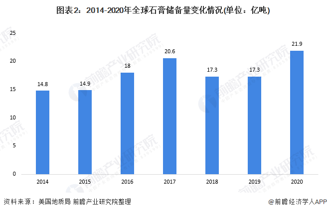 据美国地质局资料显示,2014-2020年全球石膏矿储备资源呈波动态势,2017年达到20.6亿吨,随后2018-2019年均约为17.3亿吨;2020年全球石膏储备量达到21.9亿吨。