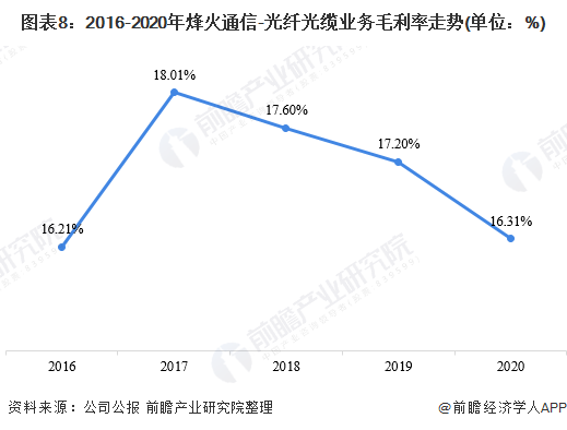 从经营业绩来看,烽火通信的光纤光缆业务收入近年来呈现波动趋势。从2016年的44.47亿元波动上升至2020年的52.4亿元。在2019年,由于行业的光纤光缆价格遭遇了腰折,下跌了将近50%的幅度。而作为行业龙头的烽火通信,其营业收入也受到了影响;2019年烽火通信的光纤光缆业务收入下跌至55亿元,较2018年下跌了14.86%。