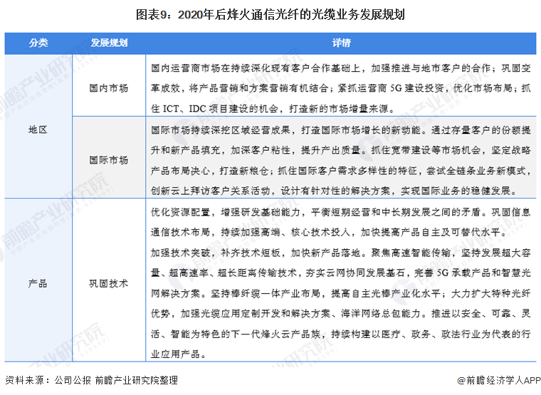 根据公司公告显示,烽火通信的光纤光缆业务的发展规划主要分为两个部分,分别是技术和巩固市场地位。其中,在国内市场,公司在持续深化现有客户合作基础上,加强推进与地市客户的合作;巩固变革成效,将产品营销和方案营销有机结合;紧抓运营商5G建设投资,优化市场布局;抓住ICT、IDC项目建设的机会,打造新的市场增量来源。