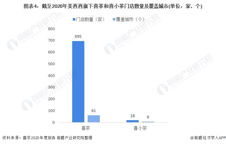 从门店数量来看,2018-2020年,美西西旗下喜茶已从183家门店增至695家门店,覆盖全球61个城市;2020年创立的喜小茶品牌已在广东省6个城市开出了18家门店。