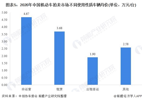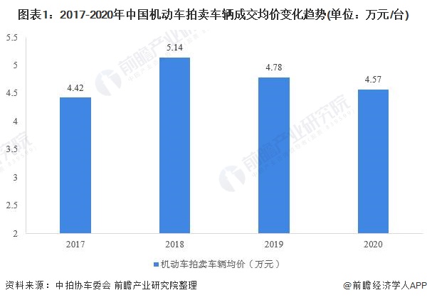 从历年发展情况来看,我国机动车拍卖行业机动车成交价格走势呈现震荡走势,2017-2020年,我国机动车拍卖市场车辆成交均价呈现先升后降的发展态势,2018年,全国拍卖车辆成交均价为5.14万元/台,为近年最高,随后价格出现连续下滑,到2020年,全国机动车拍卖车辆成交均价下降至4.57万元/台。