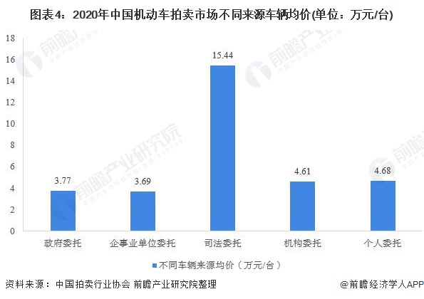 从委托来源看,政府委托、企事业单位委托车辆由于车龄长,车型老旧等问题,成交均价分别为3.77万元/台和3.69万元/台;机构委托均价为4.61万元/台,其中保险公司委托多数为残值车,均价为4.15万元/台;司法委托方面,由于年度内涉有一批高档车型,成交均价跃升至15.44万元/台;个人委托均价较去年略有下降,为4.68万元/台。