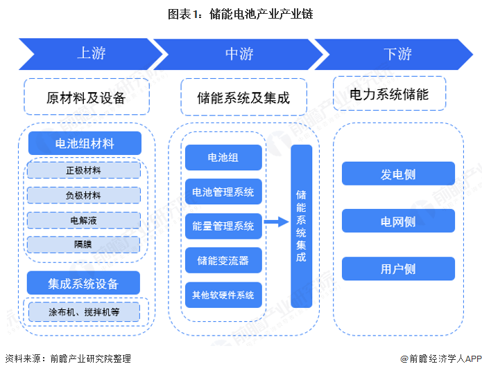储能电池产业链可分为上游原材料及设备、中游储能系统及集成、下游电力系统储能应用。储能电池上游的原材料主要包括正极材料、负极材料、电解液、隔膜以及结构件等;上游的集成系统设备主要包括涂布机、搅拌机等。产业链中游主要为储能系统的集成与制造,对于一个完整的储能系统,一般包括电池组、电池管理系统(BMS)、能量管理系统(EMS)以及储能变流器(PCS)四大组成部分。产业链下游的应用场景主要发电侧、电网侧和用户侧的电力系统储能。