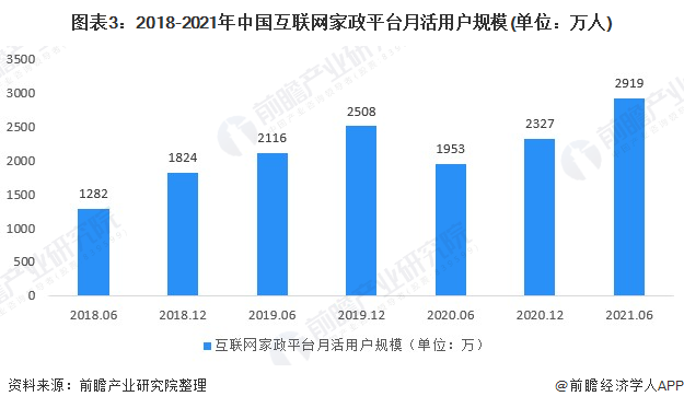 近年来,中国互联网家政服务平台用户规模不断增长,虽然经历新冠疫情冲击,2020年下半年迅速恢复,并在随后的时间继续保持增长,截止2021年6月,中国互联网家政平台月活跃用户规模达2919万人,超越疫情前的最高值2508万。