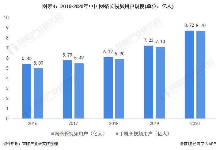 整体来看,网络长视频采取的这些措施都有利于行业的整体发展,近年来我国网络长视频用户规模和市场规模持续增长,2020年我国网络长视频用户规模达到8.72亿人,手机长视频用户规模达到8.7亿人,市场规模达到1197.2亿元。