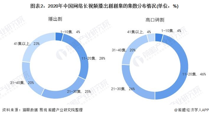 并且,为了缓解短视频、直播等新兴业态的冲击,网络长视频制作方不断创新视频制作模式,打造如互动剧、竖屏剧、微短剧等类型长视频,提高网络长视频用户粘性。据统计,2020年有4%的剧的剧集在1-10集,有28%的剧的剧集在11-20集。在高口碑剧中,同样有4%的剧的剧集在1-10集,不过有高达46%的剧的剧集在11-20集。