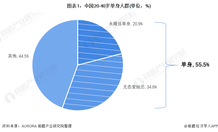 根据AURORA在2021年7月对单身群体做出的调研信息显示,目前,我国20-40岁的单身人群占比已高达55.5%,且有超过三分之一的人群为“母胎SOLO”,即没有恋爱经验的人群。