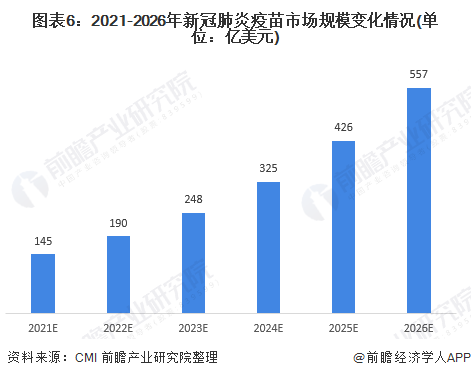 根据Coherent Market Insights(CMI)预测,2021年新冠疫苗市场规模将达到145亿美元,并保持30.90%的年复合增长率迅速扩张。经过初步核算,2026年全球新冠疫苗市场规模将会达到557亿美元。