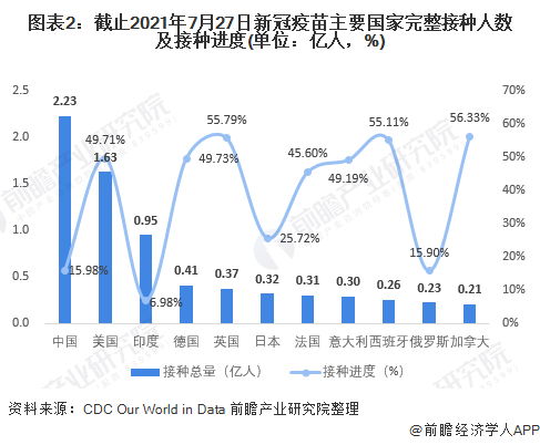 截至2021年7月27日,全球已接种疫苗达39.3亿剂次,完整接种人数10.8亿人,防控局势向好。其中中国完整接种人数最多,达到2.23亿人,但是接种进度仅有15.98%;加拿大接种进度最快,达到56.33%,但是接种人数仅有0.21亿人。