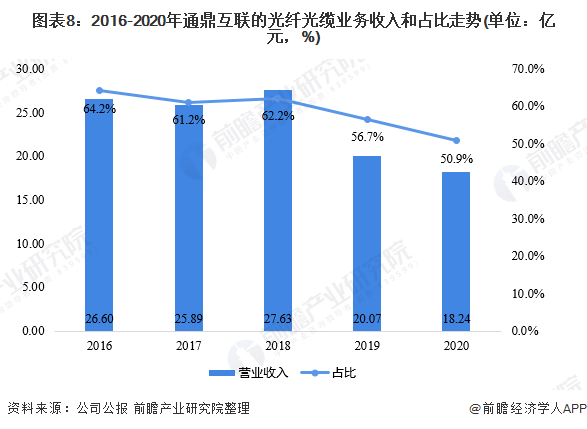 从经营业绩来看,由于2019年的光纤光缆采购价大幅下跌,导致光纤光缆业务的收入呈现大幅下跌。而2020年,受益于国内5G网络建设加快实施,国内光缆总体需求规模稳定;但由于国内运营商光缆集采价格进一步下挫,给国内光纤光缆厂商的经营带来较大的挑战。作为龙头企业的通鼎互联也不例外;2019年,通鼎互联的光纤光缆营业收入下跌至20.07亿元;而2020年继续下跌至18.24亿元。
