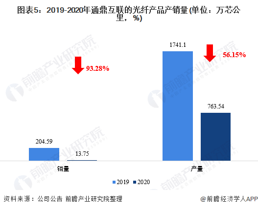 根据公司公告的数据显示,2019年-2020年公司的光纤产品产销量呈现下跌趋势;从产量来看,从2019年的1741.1万芯公里下跌至2020年的763.54万芯公里,下降约56.15%;从销量来看,从2019年的204.59万芯公里下跌至2020年的13.75万芯公里,下降约93.28%。