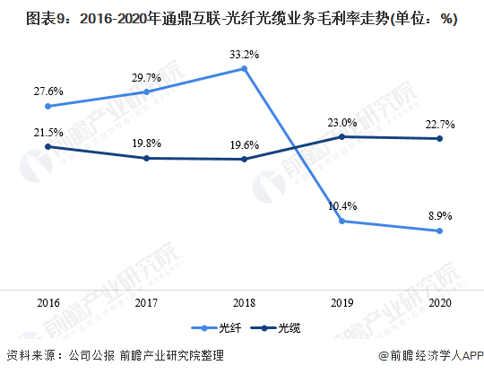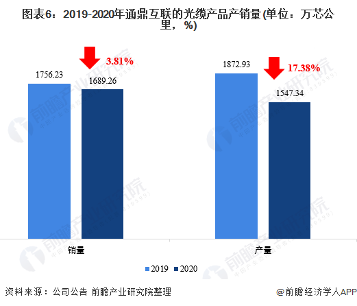 而2019年-2020年公司的光缆产品产销量也呈现下跌趋势;从产量来看,从2019年的1872.93万芯公里下跌至2020年的1547.34万芯公里,下跌约17.38%;从销量来看,从2019年的1756.23万芯公里下跌至2020年的1689.26万芯公里,下跌约3.81%。