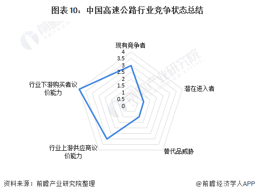 从五力竞争模型角度分析,目前,我国高速公路行业属于交通运输行业,替代品威胁较小;现有竞争者数量不多,但市场集中度较低;上游供应商一般为工程建设、道路机械等企业,议价能力适中,而下游消费市场主要是交通运输局,议价能力较弱;同时,因行业存在严格的准入资质以及资金、技术门槛较高,潜在进入者威胁较小。