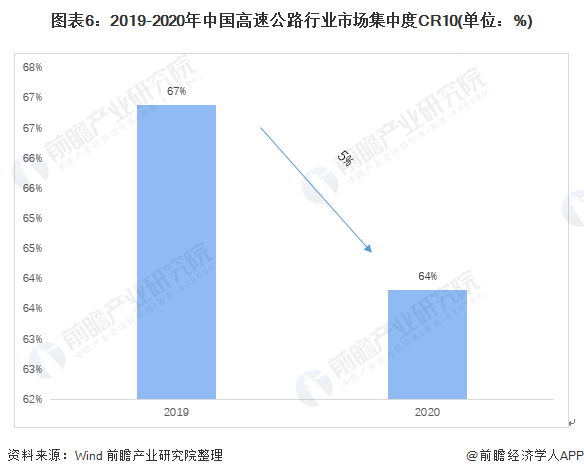 总体来看,我国高速公路行业的市场集中度适中,2020年CR10为64%,同比下降5%,2020年行业市场集中度下降的主要原因在于行业固有的经营模式:业内企业主要依靠自有资金和政府性财政预算处理项目资本金的需求,其余主要依靠举债进行前期建设投资,故在2020年新冠疫情导致整体市场下行的态势下,领先企业资金链受到的冲击相对更大。