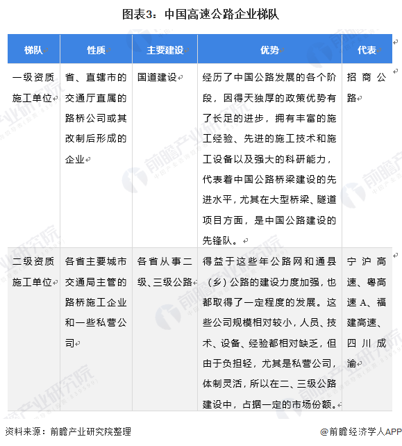 由于中国公路施工按照公路等级严格要求施工单位的资质等级,目前中国高速公路行业主要分有两级梯队,一级梯队前身大多直属交通部、交通厅的大型国有企业,由于历史形成的政府交通主管部门与下属施工单位的"直接隶属关系"和事业单位企业化管理的运行机制,使这些企业竞争意识不强,在市场中缺乏生机;二级梯队体制较为灵活,但存在产能过剩问题,据中国公路网数据,省级公路专业施工队伍闲置力量近五年仍达到1/3。