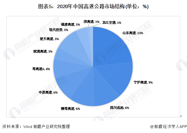 中国省际经济发展步调存在较大差异,导致各省基础建设进程以及对高速公路的市场需求都有所差别,前瞻汇总各省领先高速公路上市企业2020年营业收入数据得出行业市场结构,其中2020年山东高速所占市场份额最大,达到13%,其次是宁沪高速,市场份额达到9%;四川成渝、赣粤高速、中原高速并列第三,均占到6%。