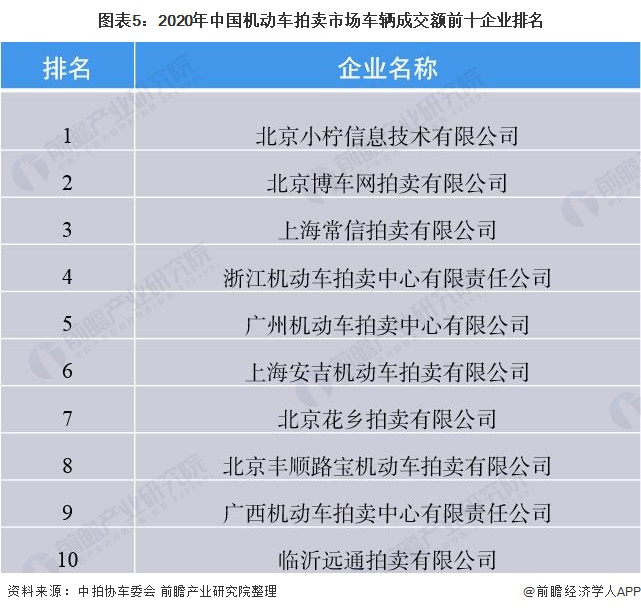 根据协会统计数据来看,我国机动车拍卖市场前十企业交易规模不断扩大,2020年,成交量排名前三的企业分别是北京小柠信息技术有限公司、北京博车网拍卖有限公司以及上海常信拍卖有限公司。