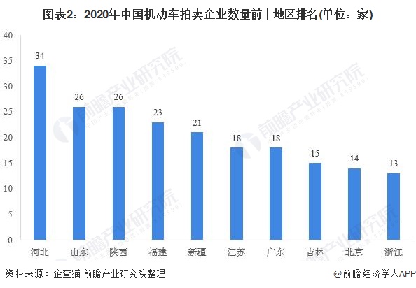 2020年,我国机动车拍卖企业最多的地区是河北省,企业数量为34家;山东和陕西紧随其后,企业数量均为26家,并列第二。