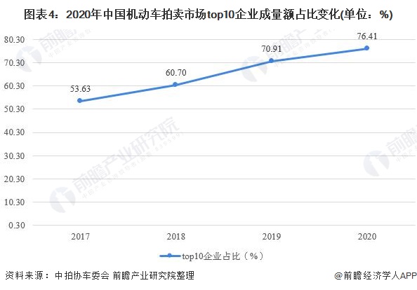 从市场占有率来看,2017年以来,前十企业成交量占比不断提升,到2020年,成交量前十名的企业合计成交车辆26.57万台,占市场总份额的76.41%,较上年同期再度提升5.5个百分点。