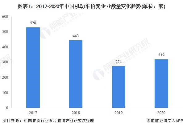 数据显示,近年来随着我国机动车拍卖行业改革的持续推进,我国机动车拍卖企业数量呈现震荡下行趋势。截至到2020年底,全国有319家拍卖企业开展机动车拍卖活动,相关从业人员2904人,以机动车拍卖为主营业务的拍卖企业增至33家。
