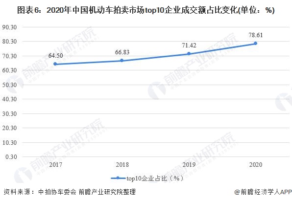从市场占有率来看,2017年以来,前十企业成交额占比不断提升,到2020年,成交额前十名的企业合计成交124.78亿元,占市场总份额的78.61%,较上年同期提升7.19个百分点。