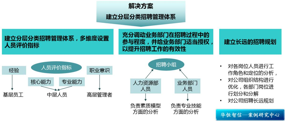 通过对该食品公司的招聘管理现状的深入了解,以及对外部同类企业优秀管理经验的深入分析,结合多年的管理咨询经验和专业研究经验,华恒智信顾问团队针对以上几个方面的问题提出建立分层分类招聘管理体系的解决方案,具体如下: