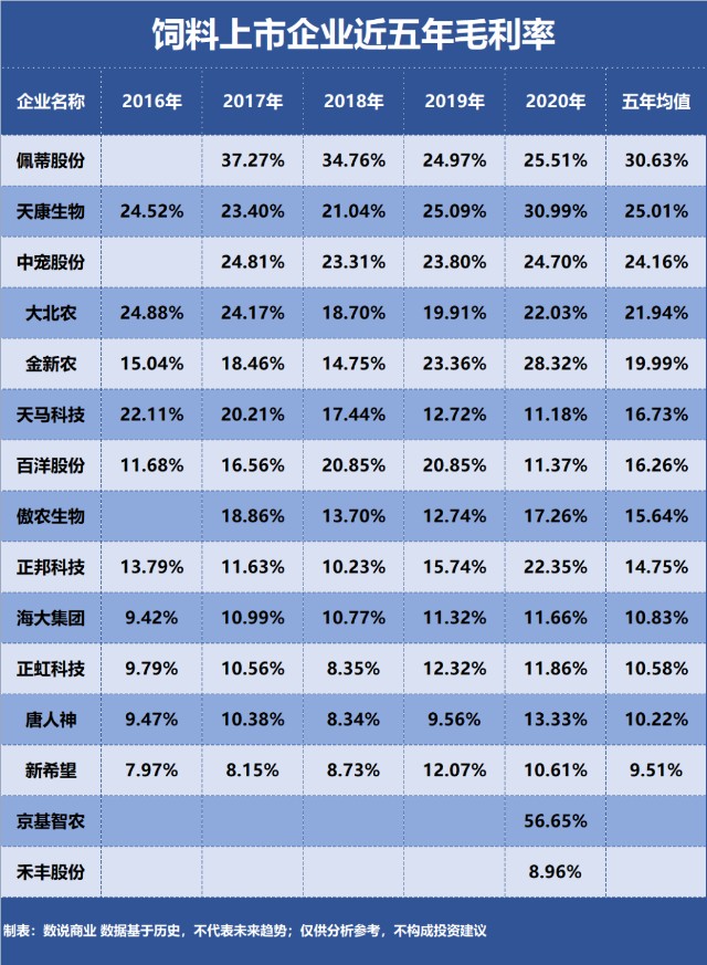 从近五年总资产收益率来看,13家企业平均总资产收益率全部为正,其中海大集团、佩蒂股份、天康生物、新希望、中宠股份、正邦科技、唐人神大北农天马科技傲农生物等10家企业在5%以上。   海大集团五年均值最高,平均总资产收益率达到10.36%,过去五年总资产收益率最高为2020年的12.29%,最低为2016年的9.45%。  毛利率是毛利与销售收入(或营业收入)的百分比,其中毛利是收入和与收入相对应的营业成本之间的差额。   从构成上看毛利是收入与营业成本的差,但实际上这种理解将毛利率的概念本末倒置了,其实,毛利率反映的是一个商品经过生产转换内部系统以后增值的那一部分。