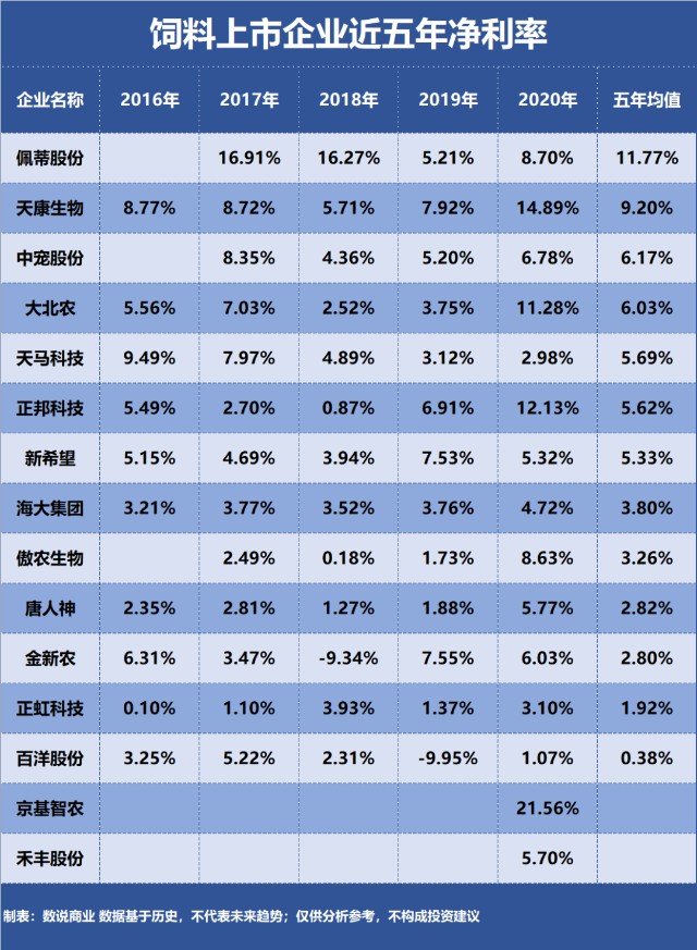 从近五年毛利率来看,佩蒂股份、天康生物、中宠股份、大北农等4家企业平均毛利率在20%以上。   佩蒂股份五年均值最高,平均毛利率达到30.63%,过去五年毛利率最高为2017年的37.27%,最低为2019年的24.97%。   新希望平均毛利率唯一不足10%,平均毛利率为9.51%,过去五年毛利率最高为2019年的12.07%,最低为2016年的7.97%。   净利率是净利润占销售收入的百分比,是指企业实现净利润与销售收入的对比关系,用以衡量企业在一定时期的销售收入获取的能力。   该指标反映每一元销售收入带来的净利润的多少,表示销售收入的收益水平。通过分析销售净利率的升降变动,可以促使企业在扩大销售的同时,注意改进经营管理,提高盈利水平。
