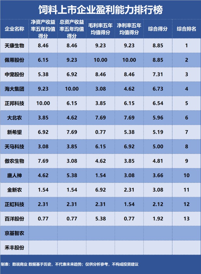 3、盈利能力排行榜单中,各项指标得分按照10/13的比例换算得出,综合得分为各项指标的平均值。如某个指标有数值,但没有得分(即表格为空格),则该指标权重会下降。