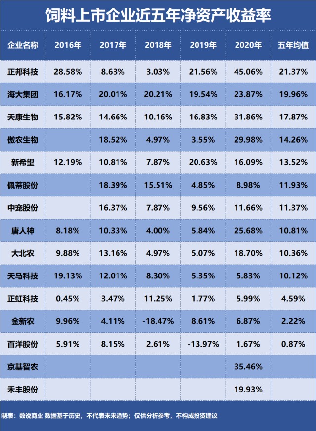 净资产收益率均值前三企业:正邦科技海大集团天康生物