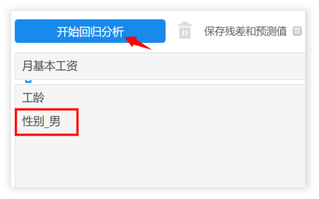 采用logistic回归,以’收入水平’、‘性别’、'年龄’作为自变量,'是否购买’作为因变量,使用【生成变量】中的【虚拟变量】将性别转化为2个哑变量,以”性别_女”作为参考项,“性别_男”放入模型分析。