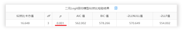 模型似然比检验用于对整体模型有效性进行分析。根据结果表明,模型似然比检验结果通过,p=0.001<0.05,说明模型构建有意义。